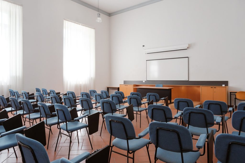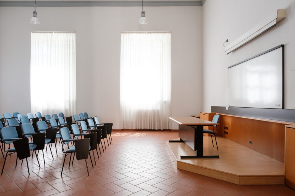 Aula 6 1 di 5 Ubicazione e accessibilità Piano terra. Platea e palco accessibili Capienza e dimensioni 50 posti. Platea con sedie con tavolino a ribaltina, scrivania relatore Attrezzature Possibilità di telo e proiettore mobile Scarica la scheda tecnica Contattaci